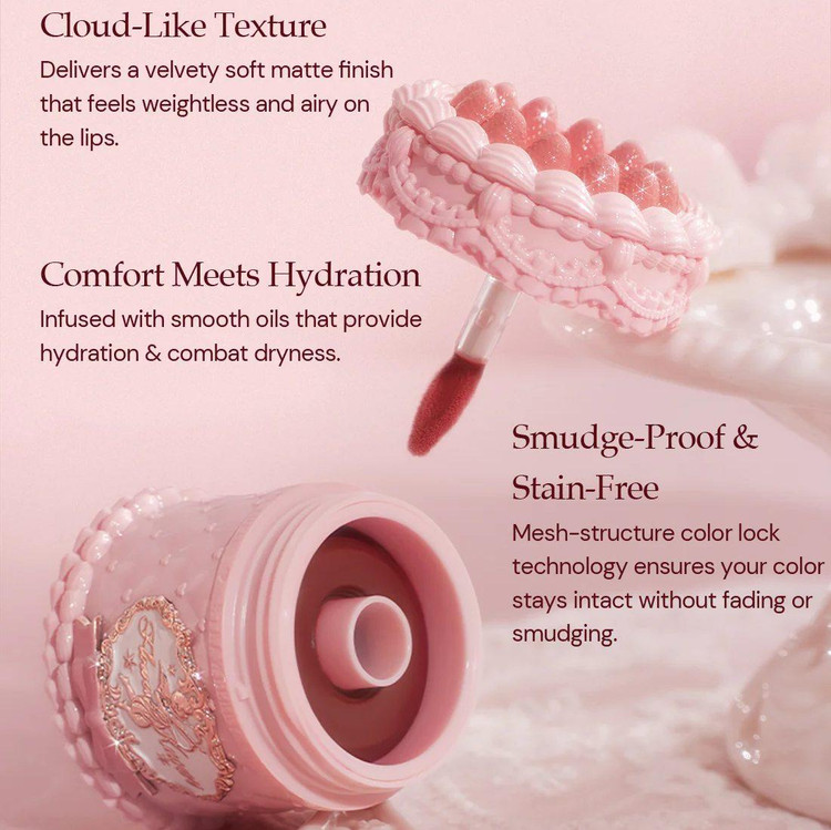 بافت ابر مانند و مخملی: این رژلب پوششی مات، نرم و سبک روی لبها ایجاد میکند که حس راحتی و لطافت را منتقل میکند بدون آنکه سنگینی یا خشکی احساس شود.